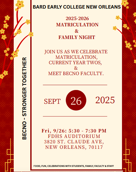 At matriculation, we will formally recognize our Year 1 students, who just began college, and our Year 2 students’ completion of their first year at BECNO. The second half of the evening will be our Family Night, during which families will “Meet and Greet” with BECNO faculty and staff, and tour BECNO. This will be an opportunity to build a stronger BECNO community in which our students and families feel welcome and engaged.
